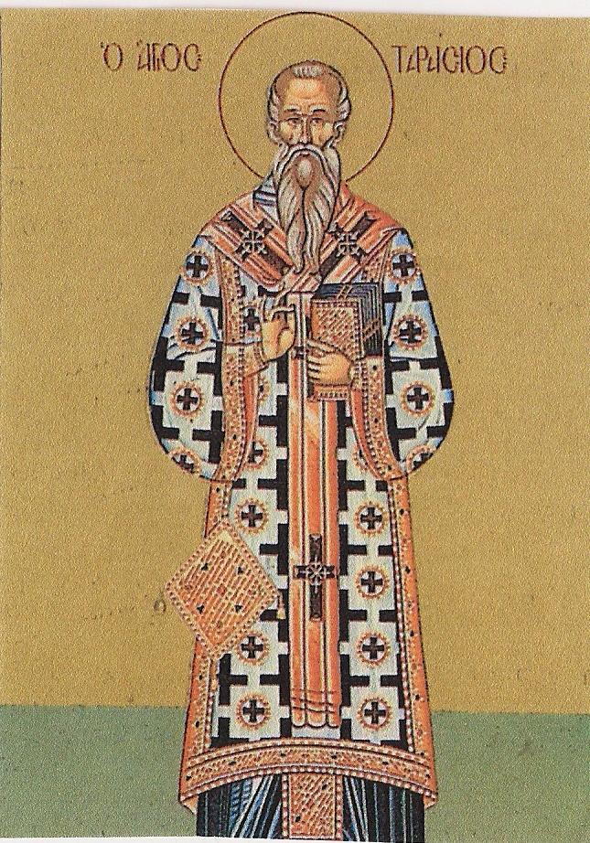 Κατὰ παθῶν βασιλεύσας τῶν τῆς σαρκός, Ἱεράρχης ἐχρίσθης θεοπρεπῶς, καὶ τὴν βασιλεύουσαν, ὀρθοδόξως ἐποίμανας, ἀπελάσας θῆρας, αἱρέσεων θεόπνευστε, τὴν τῶν σεπτῶν εἰκόνων, τρανώσας προσκύνησιν· ὅθεν μετὰ τέλος, ἀτελεύτητον χάριν, ἀξίως κεκλήρωσαι, Ἱεράρχα Ταράσιε. Διὰ τοῦτο βοῶμέν σοι. Πρέσβευε Χριστῷ τῷ Θεῷ, τῶν πταισμάτων ἄφεσιν δωρήσασθαι, τοῖς ἑορτάζουσι πόθῳ, τὴν ἁγίαν μνήμην σου.